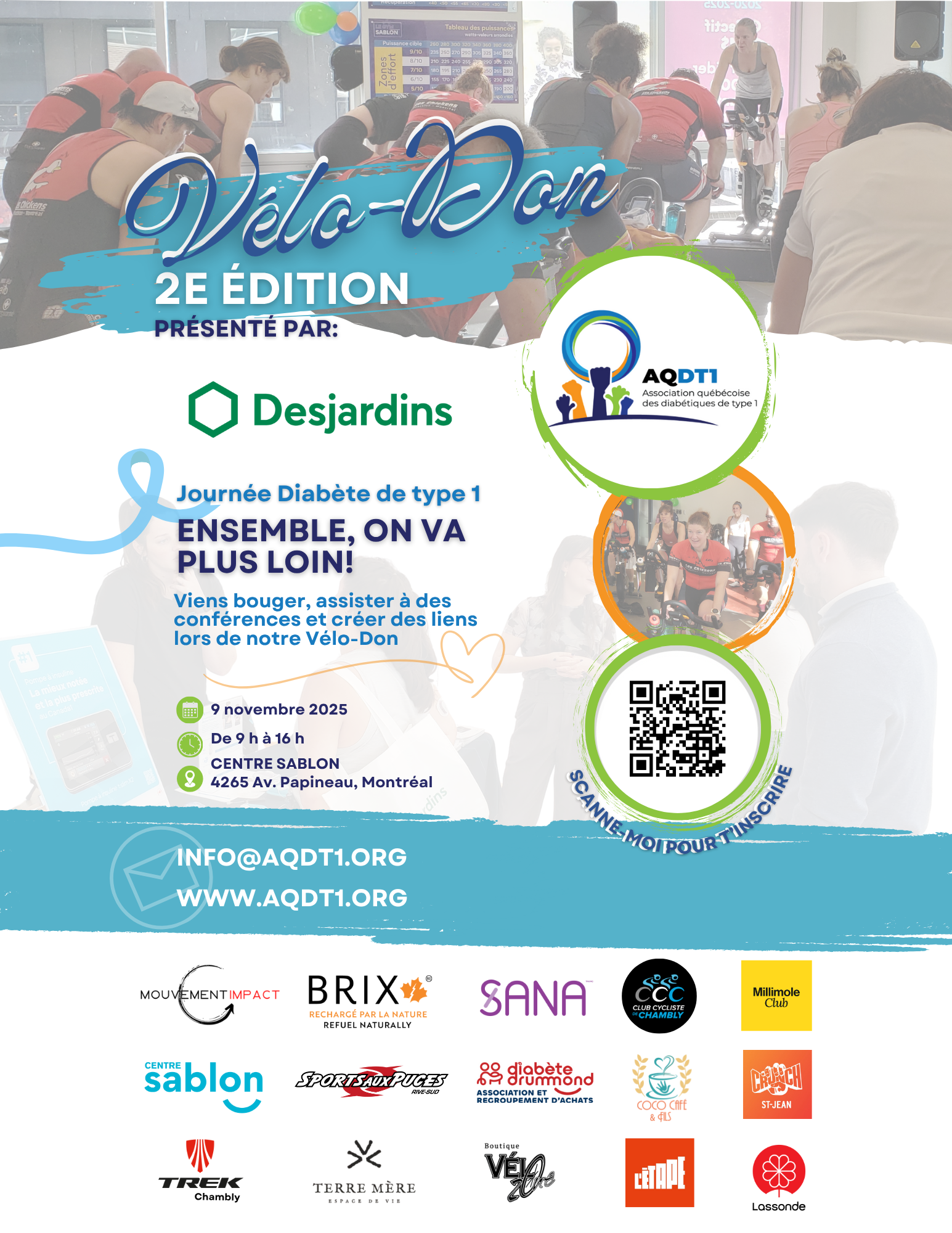 Si ta réponse est oui, l’AQDT1 est ravie de t’inviter à la deuxième édition du Vélo-Don – Journée du diabète de type 1, qui aura lieu le 9 novembre 2025 au Centre Sablon de Montréal et au Crunch Fitness de Saint-Jean-Sur-Richelieu.